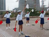 赤旗と白旗を組み合わせて、海上で遠く離れたところにいる人に正確に、そして素早く伝える手段として手旗信号を使用しています。2本の小旗を1~14の原画を組み合わせて文字にします。海洋少年団員には必要不可欠な訓練とし、入団1年後には不自由なく使用できるよう訓練します |