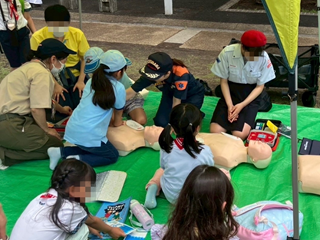 6つの体験ポイントを巡るポイントラリーが行われ、AEDの使用体験や、簡易担架を作って持ち上げたり移動したりする体験、ロープワーク、花や横浜に関するパズルなど、さまざまなプログラムが用意されていました。