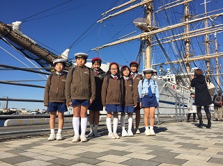 帆を 広げた帆船日本丸の前で手旗信号をおこないました。また、ロープワークもしっかりと取り組みました。