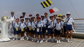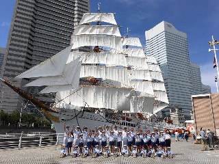 船乗り見習いの学生さんたちが乗る日本丸の船内を見学し、出航する際には手旗で『いってらっしゃい』とエールを送りました。